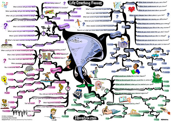 This IQ Matrix explores a process of steps a life coach would typically use to help their client work through a problem in a rational and objective way. The map presents guidelines and outlines a series questions to help a coach guide their client through the intricacies of a problem. With a solution at hand, their client becomes more resourceful and able to handle their circumstances in optimal ways. Specifically, the map breaks down how to probe for answers, how to identify obstacles, how to explore options, and finally lays down a path for solving the problem. Yes, this map is ideal for life coaches, but also extremely valuable for self-coaching purposes.