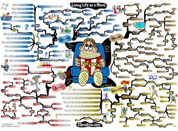 This IQ Matrix explores the value of what it would be like to pretend as though your life was a movie. In this movie you are the main character and the lead actor/actress. You are also the Director of this movie with the power to modify the script and to control the direction of each scene. Envisioning your life as a movie brings with it some incredible perspective shifts that can actually help you handle life’s hardships and emotional struggles far more effectively. The mind map breaks down what it would be like to live within a movie environment. It outlines your role as the director and actor. It then walks you through a six-step process for living your life as a movie. The map presents an empowering metaphor that we can use for sparking change and transformation. Ideal for personal use, but can also be of incredible value for life coaches who want to use this map as an empowering metaphor to help their clients make some key perspective shifts about their life and circumstances.