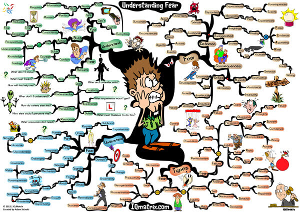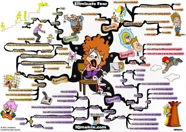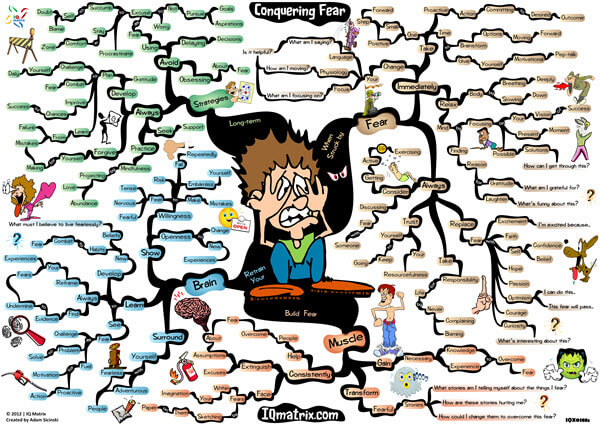 This IQ Matrix explores how to face the fears that are holding you back in life. The mind map outlines all the things you must do immediately the moment you're struck by fear. This is all about developing the necessary habits of mind for approaching your fears in optimal ways. The map also discusses how to progressively build your fear muscle over time. This is all about inoculating yourself against fear. The map walks you through how to retrain your brain to face fear with a courage centered approach. And it concludes by presenting you with several long-term strategies and guidelines for overcoming your fears and achieving your goals.