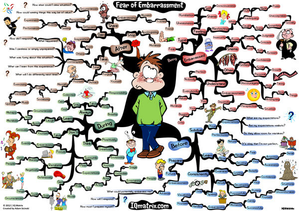 This IQ Matrix explores how to take control of your emotions and perspective when confronted with uncomfortable and awkward situations. The mind map breaks down what it means to feel embarrassed and the impact this has on our lives. It also highlights the various causes of embarrassment and the resulting consequences. Finally, the map describes exactly what to do before you get embarrassed, what to do during moments of embarrassment, and what to do after an embarrassing situation. These guidelines will help you handle potentially embarrassing experiences in optimal ways.