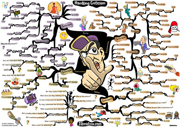 This IQ Matrix explores how to overcome your fear of criticism. The mind map provides many thought-provoking perspectives that will shift how you think and feel about criticism. No longer will you see it as a negative experience. Instead, you will begin to view criticism as an opportunity for self-understanding, growth, and development. The map breaks down how to make the most of criticism. It highlights how to work through overly harsh criticism. And, also, provides some guidance on how to give others constructive criticism.
