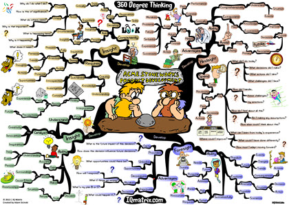 This IQ Matrix explores how to improve your ability to think about your life, problems and circumstances from a 360 degree point of view. The map breaks down how to develop the habit of using hindsight, foresight, and insight to improve your ability to make decisions and solve problems far more effectively. The map outlines the advantages of each style of thinking and lists down a series of questions to help you develop this all encompassing thinking skill.