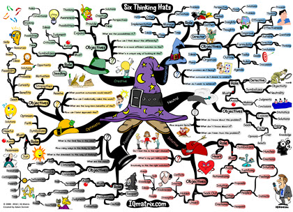 This IQ Matrix explores how to think more effectively, critically, and creatively about your problems, life, and circumstances using the Six Thinking Hat approach to problem-solving. This method for problem-solving was originally created by Edward de Bono. Each branch of this map explores one of the Six Thinking Hats. Each hat approaches the problem from a slightly different perspective. In combination, these hats can help you to effectively work through any problem you might face.