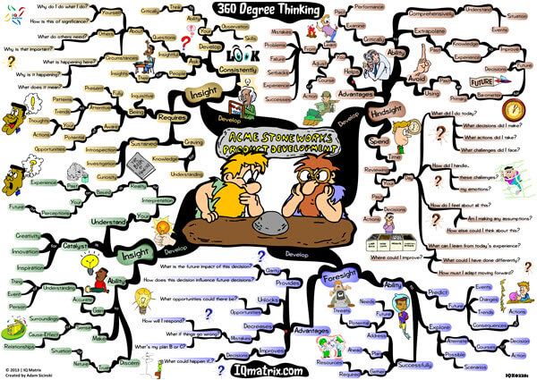 This IQ Matrix explores how to improve your ability to think about your life, problems, and circumstances from a 360-degree point of view. The mind map breaks down how to develop the habit of using hindsight, foresight, and insight to improve your ability to make decisions and solve problems far more effectively. The map outlines the advantages of each style of thinking and lists down a series of questions to help you develop this all-encompassing thinking skill. As you progressively work through this map you will develop the necessary hindsight, insight, and foresight needed to make more effective decisions throughout the day.