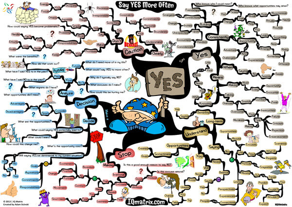 This IQ Matrix explores how saying YES more often can provide you with the exposure you need to unlock new experiences, perspectives and opportunities that can dramatically enhance the quality of your life. However, for this to happen you need to stop resisting change. It’s just easy to say NO. But, what is easy is not always better. When you say NO there is often no progress, no forward movement, and no lasting change. On the other hand, when you say YES, the world becomes full of possibilities, which can dramatically alter the course of your life forever. This mind map breaks down all the things you should be saying YES to. It outlines the underlying reasons why you tend to say NO to certain things. It walks you through the excuses that people tend to use to avoid saying YES. It provides you with a list of questions you should be asking yourself to ensure you are saying YES to the right things. And the map concludes with a few words of caution about saying YES to dangerous and reckless acts that could lead to trouble.