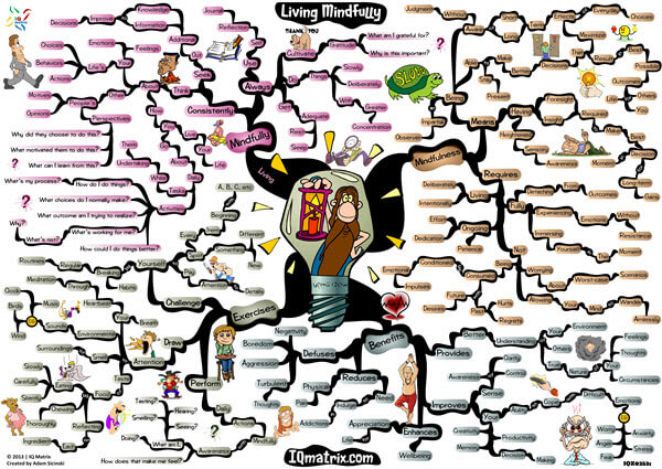 This IQ Matrix explores what it means to live more mindfully. Mindfulness is, however, not primarily about living in the moment. There’s a lot more to mindfulness than most of us realize. Mindfulness is, in fact, a mindset of self-growth and development. It’s a state of being where you live with purpose, on purpose, which essentially helps you make more effective choices and decisions throughout the day. The mind map specifically breaks down what it means to live mindfully. It highlights the value that mindfulness can bring to our lives. It outlines a series of exercises you can practice for improving your mindfulness practice. And concludes with guidelines on how to live more mindfully each day.