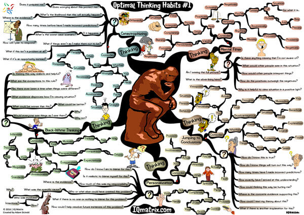 This IQ Matrix explores how to avoid common thinking errors. The map uses a series of questions that lead to perspective shifts. These perspective shifts will immediately challenge how you think about your life and circumstances. This particular map breaks down how to optimize your thinking while making the following mental errors: mental filtering, jumping to conclusions, personalization, black and white thinking, and while catastrophizing. Use the questions outlined in this map to overcome these thinking errors. The questions will encourage you to think about yourself, about others, and about your life and circumstances in more optimal and empowering ways.