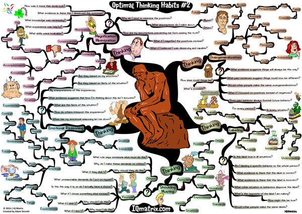 This IQ Matrix explores how to avoid common thinking errors. The map uses a series of questions that lead to perspective shifts. These perspective shifts will immediately challenge how you think about your life and circumstances. This particular map breaks down how to optimize your thinking while making the following mental errors: overgeneralizing, labeling, shoulding and musting, magnification and minimization, and while emotional reasoning. Use the questions outlined in this map to overcome these thinking errors. The questions will encourage you to think about yourself, about others, and about your life and circumstances in more optimal and empowering ways.