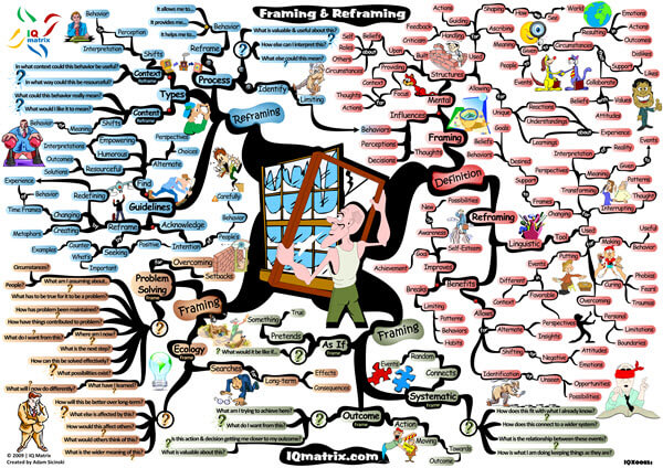 This IQ Matrix explores how to shift your perspective about your life, problems, and circumstances using NLP framing and reframing techniques. These perspective shifts will open the door to more adaptive and flexible thinking that you can apply to various aspects of your life. The mind map specifically defines what framing and reframing means. It presents you with three effective framing techniques you can begin using right away. It outlines how to use framing for problem solving. And concludes with a break down of several reframing techniques you can use to improve your life.