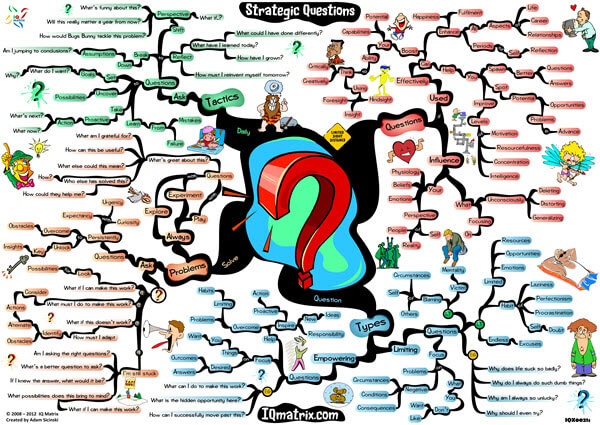 This IQ Matrix explores how to ask better questions throughout the day — questions that focus your mind on solutions, answers and ideas that can help move your life and goals forward. This is all about thinking more clearly and effectively by focusing your mind on asking questions that will naturally expand your options and the possibilities that lay before you. The map specifically breaks down the transformational power of asking effective questions. It outlines two types of questions that people tend to ask. It highlights how to use questions to solve problems. And concludes with an exploration of how to use the power of questions in a variety of ways for self-reflection, for breaking down assumptions, for shifting your perspective, and more.
