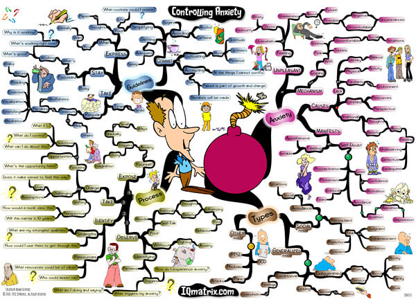 This IQ Matrix explores how to feel less anxious about uncertain situations that we often exaggerate in our imaginations. More specifically, the map walks you through how to take control of your anxiety and manage your emotional responses in far more productive ways. The mind map defines what anxiety means, outlines two common types of anxiety, presents you with a four-step process you can use to control your feelings of anxiety, and provides you with further guidelines for managing this uncomfortable emotion.