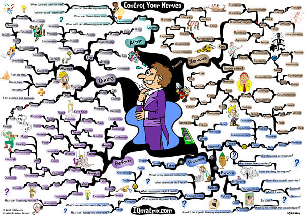 This IQ Matrix explores how to take control of your nervous before they get the better of you. The mind map breaks down the advantages and disadvantages of feeling nervous. It outlines a four-step process you can use to overcome unsettling nerves before a big event or situation. It highlights how to mentally prepare yourself before you take the plunge into uncertain territory. It outlines what to do if your nerves still get the better of you. And concludes by presenting you with a series of questions to help you learn from your experience and improve your approach the next time around.