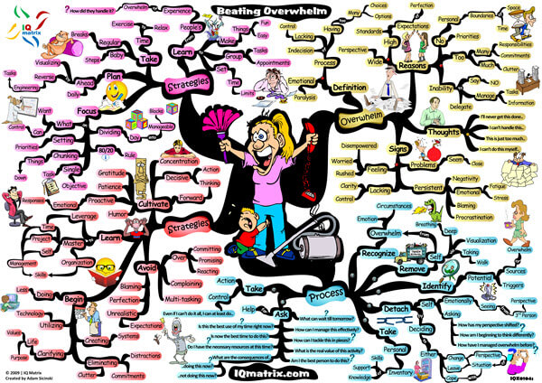 This IQ Matrix explores how to overcome moments of emotional overwhelm. The mind map presents you with effective strategies, techniques and tips to help you manage and control the avalanche of tasks, information, responsibilities, and commitments that weigh heavily on our shoulders. The mind map specifically walks you through how to take charge of this debilitating emotion. This begins by identifying "overwhelm" triggers that often tend to shake up our lives. You must then work through a seven-step process for managing your feelings of overwhelm in optimal ways. Then in the end, it all essentially comes down to perspective and letting go of the things that you can't control.