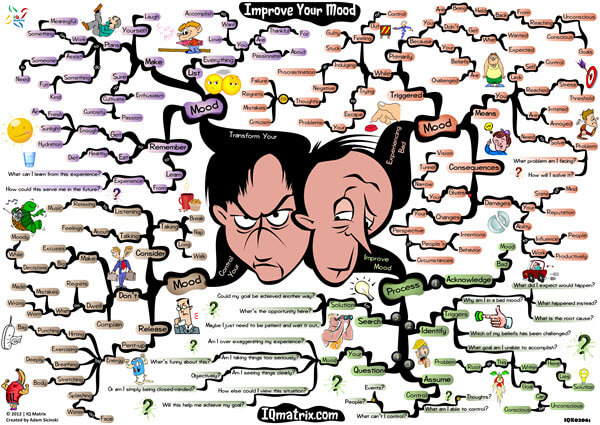 This IQ Matrix explores various steps you can take to instantly improve your mood no matter what your predicament or situation. Emotionally intelligent people understand that they are solely responsible for how they feel at any moment. They understand that their mood influences their decisions and actions. They must, therefore, effectively manage their mood to obtain their desired results. This mind map walks you through a five-step process you can use to instantly improve your mood. The map also outlines how to control your mood throughout the day, and how to transform your mood when circumstances get the better of you.