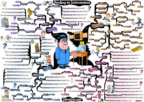 This IQ Matrix explores how to handle your emotions and how to manage the situation when an unexpected inconvenience arises. Emotional intelligence comes in many forms. And understanding how to handle yourself when inconvenienced is part of our emotional growth and development. The mind map specifically breaks down a four-step process you can use to handle inconveniences in a rational and emotionally intelligent way. The mind map is built upon a set of key questions that will help you to objectively think through and tackle any given situation that would typically emotionally unsettle other people.