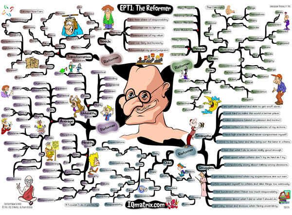 This IQ Matrix explores the first of nine Enneagram Personality Types as described within The Wisdom of the Enneagram, written by Don Richard Riso. This mind map examines the fears and motivations of a Reformer personality type, as well as how they were as a child. It lists typical strengths and struggles that The Reformer experiences over the course of a lifetime. It breaks down three levels of a Reformer’s personality. These levels explore what The Reformer is like and how they interact with the world around them at a healthy level, at a baseline (average) level, and at an unhealthy level. The map also explores how to get along with a Reformer personality type in social situations, and offers some transformational guidelines for growth and development of the Reformer personality.