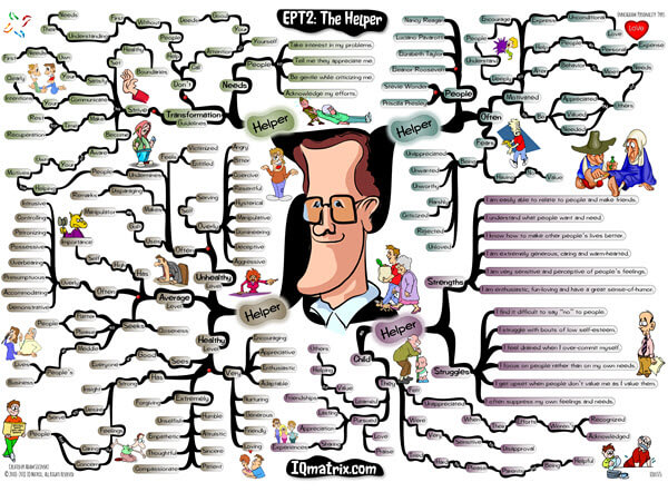 This IQ Matrix explores the second of nine Enneagram Personality Types as described within The Wisdom of the Enneagram, written by Don Richard Riso. This mind map examines the fears and motivations of a Helper personality type, as well as how they were as a child. It lists typical strengths and struggles that The Helper experiences over the course of a lifetime. It breaks down three levels of a Helper's personality. These levels explore what The Helper is like and how they interact with the world around them at a healthy level, at a baseline (average) level, and at an unhealthy level. The map also explores how to get along with a Helper personality type in social situations, and offers some transformational guidelines for growth and development of the Helper personality.