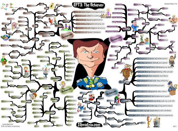 This IQ Matrix explores the third of nine Enneagram Personality Types as described within The Wisdom of the Enneagram, written by Don Richard Riso. This mind map examines the fears and motivations of an Achiever personality type, as well as how they were as a child. It lists typical strengths and struggles that The Achiever experiences over the course of a lifetime. It breaks down three levels of an Achiever's personality. These levels explore what The Achiever is like and how they interact with the world around them at a healthy level, at a baseline (average) level, and at an unhealthy level. The map also explores how to get along with an Achiever personality type in social situations, and offers some transformational guidelines for growth and development of the Achiever personality.