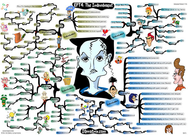 This IQ Matrix explores the fourth of nine Enneagram Personality Types as described within The Wisdom of the Enneagram, written by Don Richard Riso. This mind map examines the fears and motivations of an Individualist personality type, as well as how they were as a child. It lists typical strengths and struggles that The Individualist experiences over the course of a lifetime. It breaks down three levels of an Individualist's personality. These levels explore what The Individualist is like and how they interact with the world around them at a healthy level, at a baseline (average) level, and at an unhealthy level. The map also explores how to get along with an Individualist personality type in social situations, and offers some transformational guidelines for growth and development of the Individualist personality.