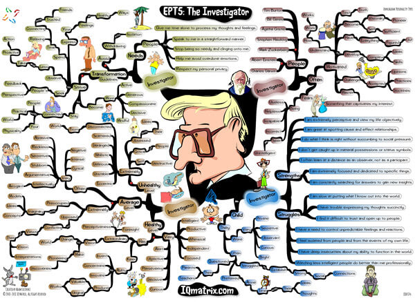 This IQ Matrix explores the fifth of nine Enneagram Personality Types as described within The Wisdom of the Enneagram, written by Don Richard Riso. This mind map examines the fears and motivations of an Investigator personality type, as well as how they were as a child. It lists typical strengths and struggles that The Investigator experiences over the course of a lifetime. It breaks down three levels of an Investigator's personality. These levels explore what The Investigator is like and how they interact with the world around them at a healthy level, at a baseline (average) level, and at an unhealthy level. The map also explores how to get along with an Investigator personality type in social situations, and offers some transformational guidelines for growth and development of the Investigator personality.