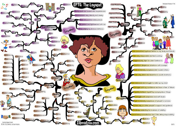 This IQ Matrix explores the sixth of nine Enneagram Personality Types as described within The Wisdom of the Enneagram, written by Don Richard Riso. This mind map examines the fears and motivations of a Loyalist personality type, as well as how they were as a child. It lists typical strengths and struggles that The Loyalist experiences over the course of a lifetime. It breaks down three levels of a Loyalist's personality. These levels explore what The Loyalist is like and how they interact with the world around them at a healthy level, at a baseline (average) level, and at an unhealthy level. The map also explores how to get along with a Loyalist personality type in social situations, and offers some transformational guidelines for growth and development of the Loyalist personality.