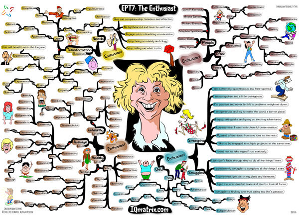 This IQ Matrix explores the seventh of nine Enneagram Personality Types as described within The Wisdom of the Enneagram, written by Don Richard Riso. This mind map examines the fears and motivations of an Enthusiast personality type, as well as how they were as a child. It lists typical strengths and struggles that The Enthusiast experiences over the course of a lifetime. It breaks down three levels of an Enthusiasts personality. These levels explore what The Enthusiast is like and how they interact with the world around them at a healthy level, at a baseline (average) level, and at an unhealthy level. The map also explores how to get along with an Enthusiast personality type in social situations, and offers some transformational guidelines for growth and development of the Enthusiast personality.