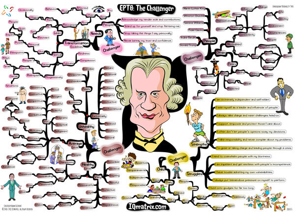 This IQ Matrix explores the eighth of nine Enneagram Personality Types as described within The Wisdom of the Enneagram, written by Don Richard Riso. This mind map examines the fears and motivations of a Challenger personality type, as well as how they were as a child. It lists typical strengths and struggles that The Challenger experiences over the course of a lifetime. It breaks down three levels of a Challenger's personality. These levels explore what The Challenger is like and how they interact with the world around them at a healthy level, at a baseline (average) level, and at an unhealthy level. The map also explores how to get along with a Challenger personality type in social situations, and offers some transformational guidelines for growth and development of the Challenger personality.