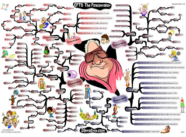 This IQ Matrix explores the ninth of nine Enneagram Personality Types as described within The Wisdom of the Enneagram, written by Don Richard Riso. This mind map examines the fears and motivations of a Peacemaker personality type, as well as how they were as a child. It lists typical strengths and struggles that The Peacemaker experiences over the course of a lifetime. It breaks down three levels of a Peacemaker's personality. These levels explore what The Peacemaker is like and how they interact with the world around them at a healthy level, at a baseline (average) level, and at an unhealthy level. The map also explores how to get along with a Peacemaker personality type in social situations, and offers some transformational guidelines for growth and development of the Peacemaker personality.