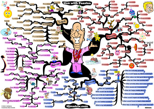 This IQ Matrix explores how to live with more passion, purpose and enthusiasm as you work toward the achievement of your goals. The mind map defines what it means to live with passion. It highlights the benefits of living with passion and the positive impact this can have on your life. It presents you with a set of questions to help you discover and unleash your passions. It walks you through a series of steps for tapping into your passions each day. It concludes by listing down a number of passion traps that are likely to sabotage your progress as you work toward your goals. Working through this map will help you find more passion, enthusiasm, and a zest for living your life with a sense of purpose.