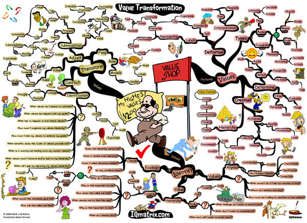 This IQ Matrix explores how to uncover your values and align them with your personal goals, life’s purpose, and objectives. The mind map guides you through this process of value transformation by presenting you with a variety of questions that help you to elicit and transform your values. Specifically, the mind map explores the difference between moving away, moving towards, means and ends values. It presents you with a set of questions that will help you structure your values hierarchy. The mind map concludes with an explanation of how to modify your values to better meet your life’s goals and objectives. Working through this map will help you to live life with a deeper sense of purpose that is aligned with your core values.