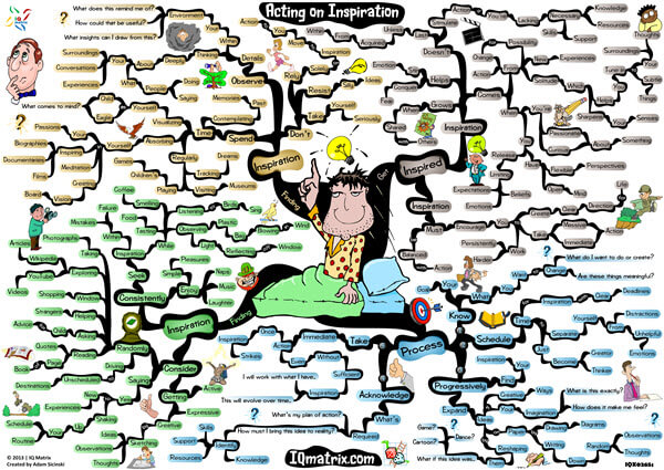This IQ Matrix explores how to find the inspiration you need to take positive action working toward your goals. While this map is about inspiration, it’s important not to get lost trying to find endless sources inspiration. Sometimes we want to find inspiration so badly that we forget that inspiration often results from action. When you take purposeful action, that is when you gain the necessary insight you need to realize a breakthrough. Inspiration is, therefore, only one part of the puzzle, and probably not the most important part. This mind map walks you through what it takes to find inspiration. It breaks down a five-step process for finding inspiration. And concludes by presenting you with further guidelines and suggestions to help you move from a state of inspiration to inspired action.