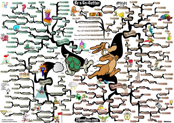 This IQ Matrix explores what it takes to join the ranks of the highest achievers in the world. High achievers are Go-Getters. They know what they want and they do everything within their means to ensure they get everything they go after. These people don’t get sidetracked by problems, rejection, criticism or failure. They instead thrive when faced with problems and setbacks. They allow absolutely nothing to stand between them and their desired objectives. And, often, they get exactly what they want or better. Some, will, of course, call them lucky. And on the surface it might seem that way. Go-Getters are lucky. However, this ain't dumb luck. They have learned how to generate their own luck as they pursue their goals. This mind map breaks down the various habits, beliefs, attitudes, and behaviors of high achievers. It walks you through the mindset Go-Getters consistently bring to every situation. And it also outlines all the things that high achievers avoid doing that the average person often succumbs to.