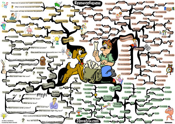 This IQ Matrix explores how to work through any problem successfully by tapping into your inner reservoir of resources. However, this is more than just about making the most of your skills and abilities. This is also about adapting to your situation and using your creativity and ingenuity to create something out of nothing. In other words, it's all about generating purpose-driven luck. The objective is to create something that will help move you forward in optimal ways. Furthermore, being resourceful is about taking the initiative to improve your life and circumstances regardless of the challenges you face. This mind map outlines what it means to be resourceful. It breaks down two types of resources that you have at your disposal. It walks you through how to handle unexpected problems in a resourceful way. And concludes by presenting you with further guidelines for developing a resourceful mindset as you work toward your goals.