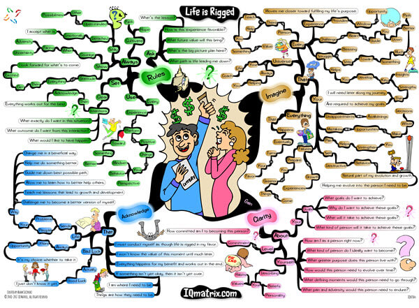 This IQ Matrix explores how to handle problems and adversity far more effectively by interpreting our experiences in a more favorable and empowering way. Instead of feeling like a victim of circumstance (when things don’t turn out as expected) you can learn to challenge yourself to see circumstances more favorably. You can, for instance, convince yourself that no matter what happens, life is actually rigged in your favor. Therefore, no matter how bad things seem right now, your journey isn’t over and things will inevitably get better. Life is slowly putting the pieces together to help you get what you want or something better. As long as you don’t quit and keep moving forward, you will inevitably get what you want. This map presents an empowering metaphor we can use to help us live a better life. It’s also of incredible value for life coaches who would like to help their clients become more resourceful and creative during times of struggle, adversity, and hardship.