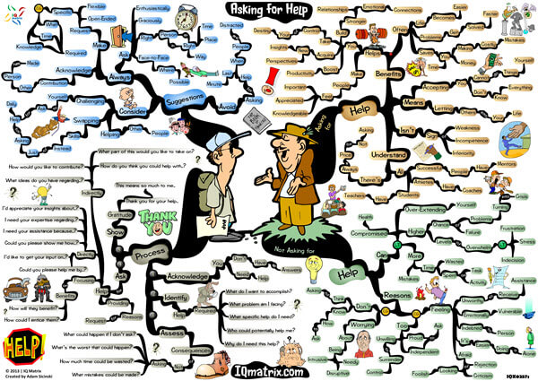 This IQ Matrix shows you how much easier things get and how much luckier you can become when you develop the habit of asking for help. When you ask for the right kind of help at the right time, your whole life changes. You solve problems faster, you save time, you gain better insights, you get luckier, and you create deeper connections and emotional bonds with other people. However, asking for help in the wrong way can, of course, be quite detrimental to your success. The mind map explores the numerous benefits of asking for help. It goes through the consequences of not asking for help. It outlines a six-step process you can use to ask for help in the right way. And it provides you with numerous guidelines for getting the most from other people.
