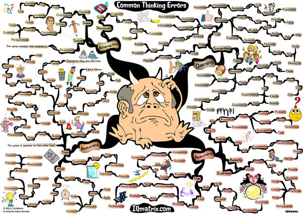 This IQ Matrix explores common thinking flaws that many of us tend to indulge in that sabotage our progress as we work toward our goals. These errors in thinking lead to poor choices and decisions that guide us down a less than optimal path. Overcoming these thinking errors, of course, won’t be easy as they are deeply ingrained in our psyche. This map will help you become aware of these thinking errors. And as you work your way through them you will begin to question your own view of reality. No longer will you be swayed by your past. You will instead be open to the many possibilities and interpretations that exist in the present moment. All this will help you gain more clarity, which will improve your decisions and help you generate more luck as you work toward your goals.
