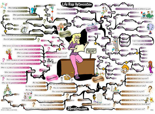 This IQ Matrix explores how to optimize how you live your life through the roles you choose to play each day. We all play various roles in life. Some roles we are born into, while other roles are based on the choices we make. Sometimes we play roles that correspond to certain life experiences, while at other times these roles are based on things we identify with. We are in fact playing many different roles over a lifetime. Balancing those roles and making the most of each role isn’t easy. However, it doesn’t need to be an overwhelming experience. Within this IQ Matrix, you will learn how to optimize your life roles and find more balance, happiness, and fulfillment in your life. The mind map specifically walks you through a seven step exploratory process you can use to optimize how you live life through the roles you play.