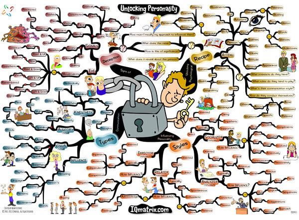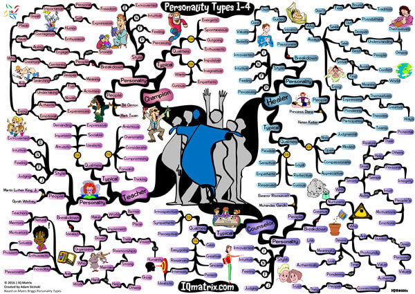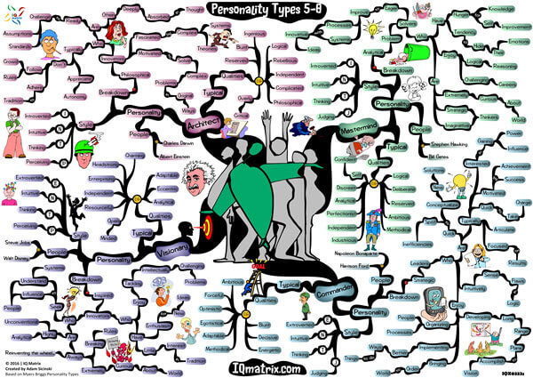 This IQ Matrix breaks down 4 of the 16 personality types identified by the Myers Briggs Personality Type Indicator. The personality types broken down within this map include The MasterMind (INTJ), The Commander (ENTJ), The Visionary (ENTP), and The Architect (INTP). For each of the four personality types explored within this map the IQ Matrix breaks down the qualities, behavior, and interests applicable to each type. Reading through each branch will help you to better recognize whether or not each specific personality type is a fit for you or for the people in your life. As a result you will be better able to adapt to the various personality types you come across in your daily interactions with others. Moreover, this understanding will help you to more readily and easily influence other people based on their personality type.