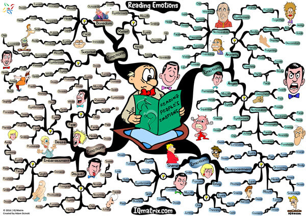 This IQ Matrix explores how to recognize several common human emotions through reading facial expressions and other nonverbal cues. The emotions we experience internally often manifest in how we express ourselves externally. Whether it comes through our facial expressions, hand gestures, body language or physiological responses — every emotional experience brings with it key indicators that reveal what we're feeling. Understanding how to recognize the emotions of another person will help you adapt your communication style to better empathize with them. In this way you can create deeper bonds that will help you gain more influence and respect in other people’s eyes. This mind map specifically walks you through how to read and recognize the emotion of anxiety, anger, disappointment, envy, shame, disgust, embarrassment, desire, fear, surprise, boredom, and grief.