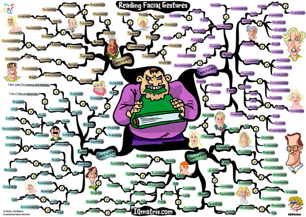 This IQ Matrix explores how to better recognize and understand the meaning of various facial expressions and gestures that people tend to use. We are typically very conscious of the way we express ourselves verbally. The words we speak communicate to people what’s on our minds. However, people don’t always say what’s on their mind. In fact, people may hold back and refrain from speaking their mind in various social situations. People may even consciously choose to mislead us with their choice of words. Given this, their words will often not reveal what they're thinking and feeling internally. However, what’s hidden within still expresses itself externally through people’s facial gestures in numerous ways. This mind map breaks down the underlying meaning of various facial gestures pertaining to a person's head, face, cheeks, chin, mouth, lips, eyes, teeth, tongue, nose, and forehead. The map examines how people typically use their face to express their thoughts, emotions and feelings in a variety of ways.