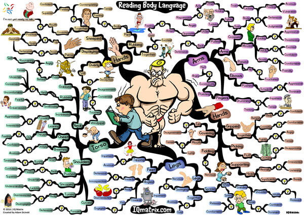 This IQ Matrix explores how to better recognize and understand what various hand, arm, leg, and torso gestures reveal about a person. It is said that 80 percent of the conversation we have with another person comes through the body, while only 20 percent comes from the words people speak. We typically think through the words we will speak, but rarely, if ever, do we consciously control our body movements. In fact, many people are probably unaware of the powerful subtle message they send through their physiology. This message typically reveals their hidden thoughts, feelings, opinions, and motives. Working through this map will help you to better understand these signals so that you can more effectively read people’s true intentions, and subsequently adapt your conversation style to influence their behavior. The map specifically walks you through how to interpret movement and positioning of the arms, elbows, fingers, hands, legs, feet, torso, shoulders, chest, and neck.