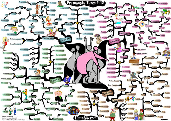 This IQ Matrix breaks down 4 of the 16 personality types identified by the Myers Briggs Personality Type Indicator. The personality types broken down within this map include The Provider (ESFJ), The Performer (ESFP), The Protector (ISFJ), and The Composer (ISFP). For each of the four personality types explored within this map the IQ Matrix breaks down the qualities, behavior, and interests applicable to each type. Reading through each branch will help you to better recognize whether or not each specific personality type is a fit for you or for the people in your life. As a result you will be better able to adapt to the various personality types you come across in your daily interactions with others. Moreover, this understanding will help you to more readily and easily influence other people based on their personality type.