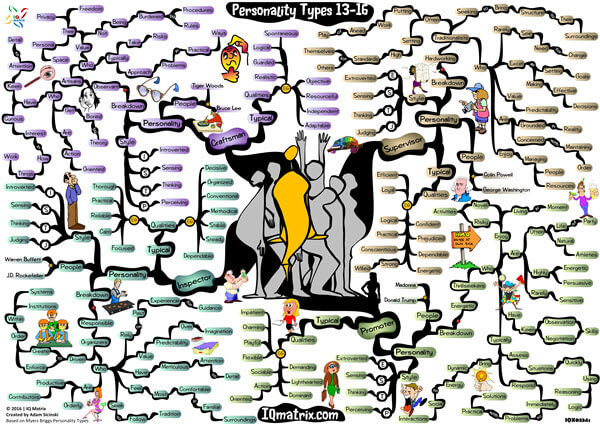 This IQ Matrix breaks down 4 of the 16 personality types identified by the Myers Briggs Personality Type Indicator. The personality types broken down within this map include The Supervisor (ESTJ), The Promoter (ESTP), The Inspector (ISTJ), and The Craftsman (ISTP). For each of the four personality types explored within this map the IQ Matrix breaks down the qualities, behavior, and interests applicable to each type. Reading through each branch will help you to better recognize whether or not each specific personality type is a fit for you or for the people in your life. As a result you will be better able to adapt to the various personality types you come across in your daily interactions with others. Moreover, this understanding will help you to more readily and easily influence other people based on their personality type.