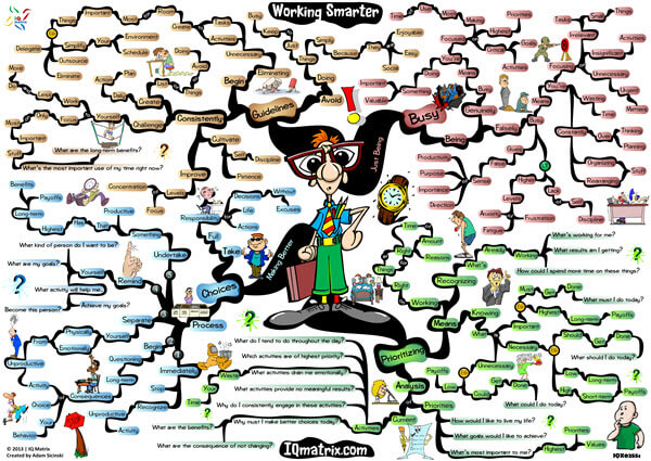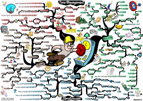 This IQ Matrix explores how to manage your time more effectively throughout the day. Time management isn't so much about managing time, but rather about managing yourself and how that impacts the time you have. When you are better able to manage yourself, you naturally make better use of time throughout the day. This mind map specifically walks you through a four-step process you can use to gain more control over yourself and over your time. It presents you with various guidelines for managing your time more effectively throughout the day. It shows you how to gain more time throughout the day. And it breaks down common time wasters that often sidetrack us while working on tasks and projects. Working through this map will help you to become more aware of how you use your time and manage yourself throughout the day. Understanding how to upgrade your usage of time will improve your output and productivity as you work toward your goals.