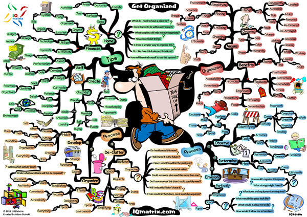 This IQ Matrix explores how improving your productivity begins with improving your personal organization skills. When we are better organized we work more efficiently. Moreover, there is less to think about and do. This saves time and helps us focus on our highest priority tasks and activities without distraction or hindrances. When it comes to personal organization it's about you and about your environment. They work in tandem to help improve your output and productivity. This mind map outlines what it means to get organized and the positive impact this can have on our lives. It breaks down a six-step process you can use to get organized and stay organized throughout the day. And the map concludes by presenting you with various guidelines for organizing your home, finances, and life. Working through this map will help you develop the organizational habits you need to work more productively.