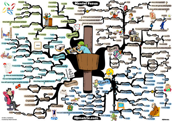 This IQ Matrix explores how to develop your ability to focus more effectively on your goals, tasks, and routines. As you improve your mental focus, this will naturally enhance your output and productivity throughout the day. This mind map identifies various ways to improve your mental focus as it relates to setting and achieving your goals. It outlines a six-step process you can use to stay focused on your highest priority activities throughout the day. It explores your environment and how to modify it to improve your focus and concentration. It delves into daily and weekly routines and how to improve them to stay focused for longer. And the map concludes by breaking down the mindset we must cultivate to become more focused and driven as we work toward our goals. Working through this map will significantly help improve your ability to focus while working on tasks and activities.
