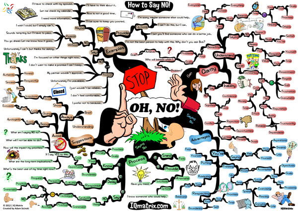 This IQ Matrix explores scenarios where it’s helpful and beneficial to say NO to people in various situations. The mind map outlines how in certain situations saying YES is actually hurting you. It highlights the advantages of saying NO and the value this can bring to your life. It walks you through a five-step process that will help you say NO to anyone at any time in a polite and non-offensive way. It provides you with guidelines for saying NO with confidence. And it presents you with several ready-made one-liners you can use to say NO to people when it matters most. As you work through this map you will get better at understanding when it would be best to say NO in certain instances. This will subsequently boost your productivity and free up your time to focus on the things that matter most.