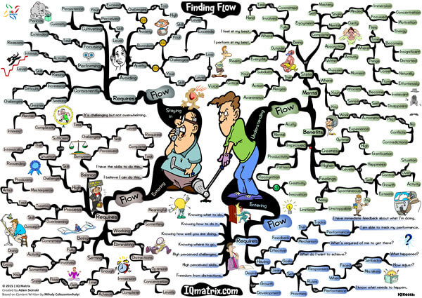 This IQ Matrix explores what it takes to get into a flow state to help you perform at peak levels of your ability. Being “in the flow” is a mental state where time seems to disintegrate before our eyes. It’s a state where you become one with what you’re doing — one with the moment. And, as a result, you take more purposeful action. In sports, getting into a flow state is often referred to as “being in the zone”. However, getting into flow isn’t only for athletes. It’s actually for anyone who desires to work at optimal levels with one definitive purpose in mind. It’s for anyone who wants to get more done in less time with higher levels of creative output. This concept was first introduced by Mihaly Csikszentmihalyi. The mind map breaks down what it means to be in a flow state. It outlines how to specifically get into a flow state. And it concludes with an overview of how to maintain a flow state for extended periods.
