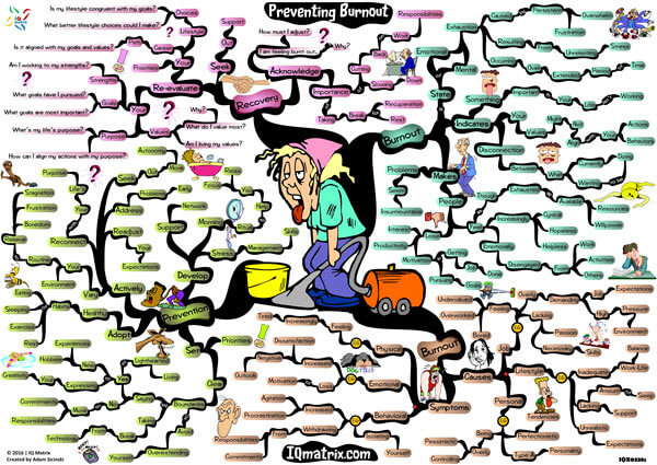This IQ Matrix explores how to avoid getting emotionally, mentally and physically burnt out. However, if you do end up suffering from burnout, then this map also explores how to recover from a burnout episode. Burnout is, of course, not the same as stress. Stress is a temporary condition that we can learn to manage more effectively. Burnout on the other hand comes about when we experience prolonged and unrelenting (somewhat uncontrolled) stress that occurs over an extended period of time. Unable to effectively deal with this stress the body fatigues and the mind begins to disengage from all work activities. That is when burnout takes hold. This map will, however, help you to avoid the pitfalls of burnout by providing you with various guidelines and suggestions that will allow you to manage your life and responsibilities in far more effective ways.