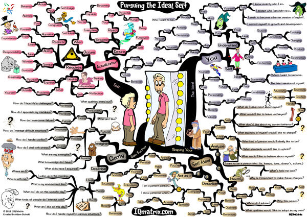 IQ Doodles are fun cartoon doodles that outline a very specific series of practical steps for improving various aspects of your life. Each IQ Doodle is linked to a topic outlined within a mind map. They are the perfect companion for each IQ Matrix.